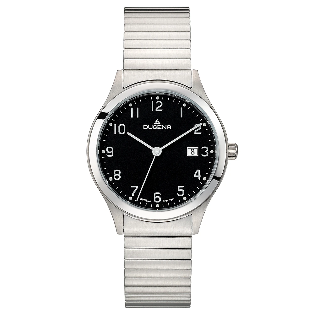 Pánské hodinky z chirurgické oceli s pružným náramkem. Díky pružnému náramku a přehlednému černému ciferníku s bílým číselníkem se jedná o velmi oblíbený model pánských náramkových hodinek. Hodinky jsou vybavené datumkou, hodinovou, minutovou a vteřinovou ručkou. Hodinky mají odolné minerální sklíčko a jsou voděodolné na úrovni 5 ATM. Průměr pouzdra 37 mm. Chod těchto pánských hodinek zajišťuje spolehlivý bateriový strojek. Všechny hodinky Dugena jsou dodávané v originální krabičce. Na hodinky Dugena je poskytována záruku v délce 36 měsíců.