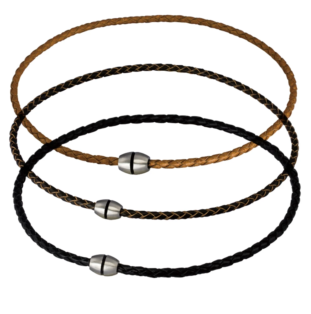 Kožený náhrdelník pro muže s ozdobným zapínáním. Ocelové magnetické zapínání má matný povrch po obvodu zdobený černým proužkem. Průměr zapínání 10mm. Kožená pletená část náhrdelníku má průměr 4mm, délka náhrdelníku 45cm.