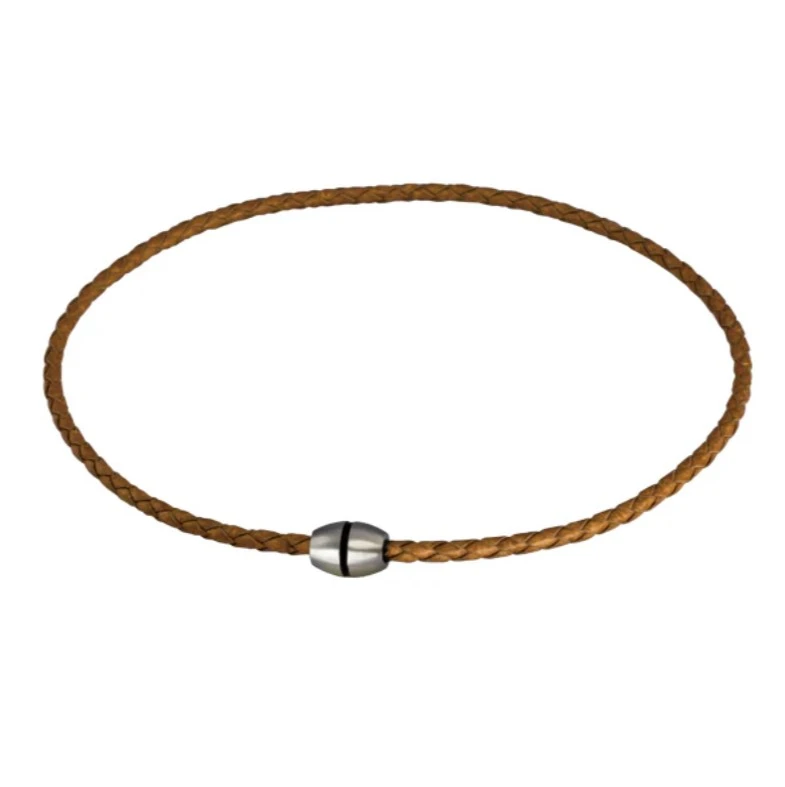 Kožený náhrdelník pro muže s ozdobným zapínáním. Ocelové magnetické zapínání má matný povrch po obvodu zdobený černým proužkem. Průměr zapínání 10mm. Kožená pletená část náhrdelníku má průměr 4mm, délka náhrdelníku 45cm.