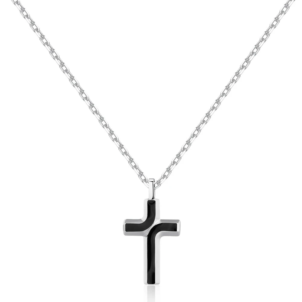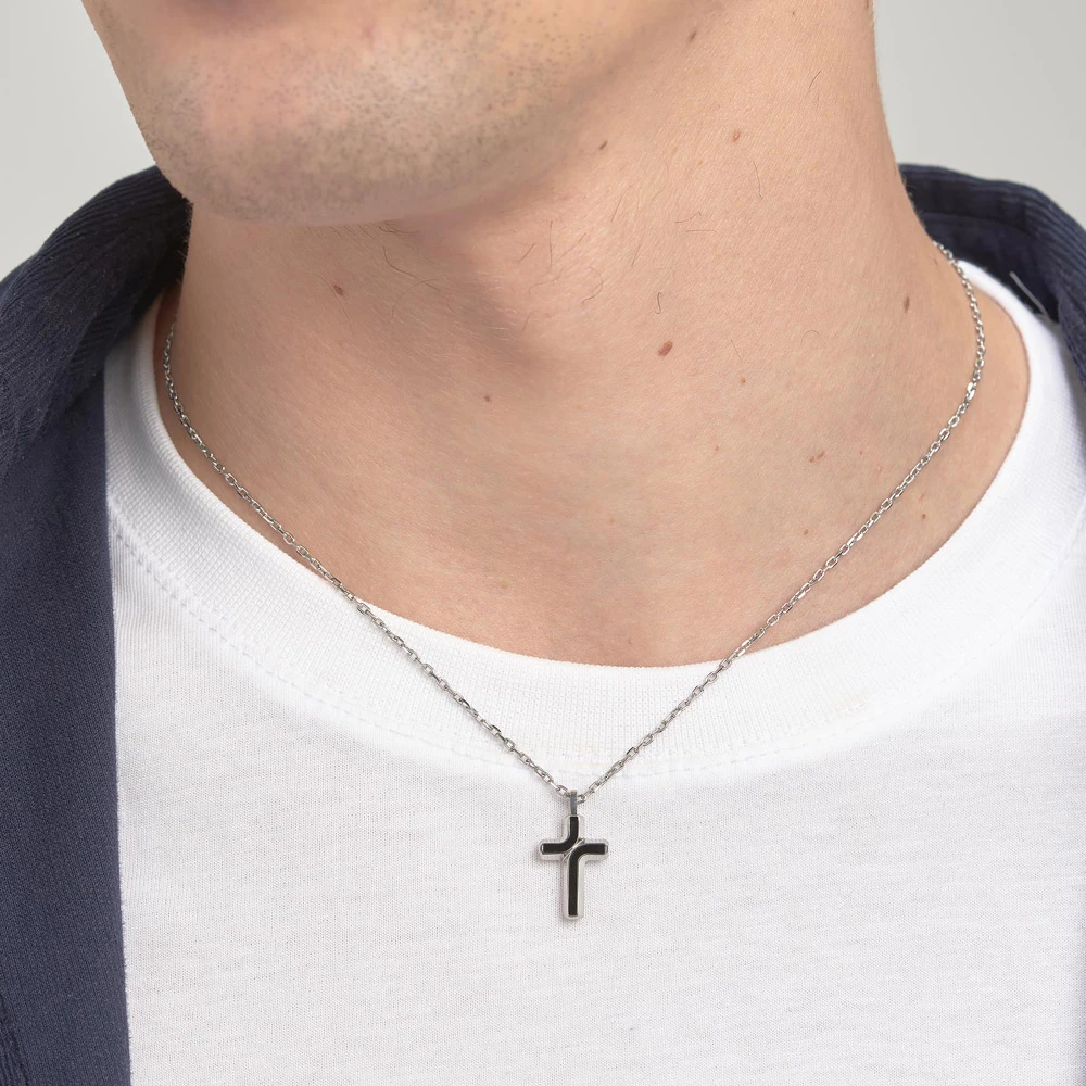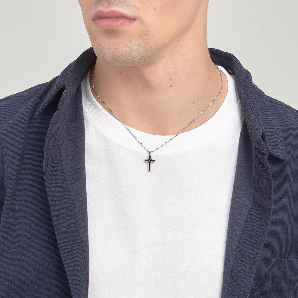 Pánský náhrdelník z chirurgické oceli 316L. Náhrdelník tvoří přívěsek křížek s leštěným povrchem a černým smaltem. Křížek je zavěšený na ocelovém řetízku dlouhém 48cm.