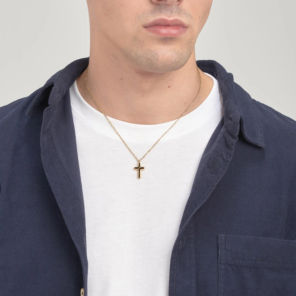 Pánský náhrdelník křížek z chirurgické oceli 316L. Povrch náhrdelníku je pozlacený technologií PVD. Černá barva na křížku je smalt. Délka náhrdelníku 48cm.