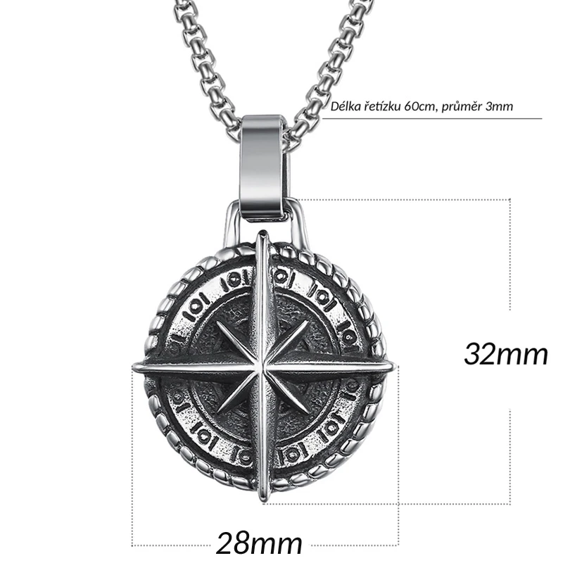 Náhrdelník z chirurgické oceli se směrovou růžicí, kterou k navigaci používali již staří Vikingové. Povrch přívěsku je matný s šedou patinou, růžice má povrch leštěný. Přívěsek se směrovou růžicí je zavěšený na řetízku z chirurgické oceli dlouhém 60cm, průměr řetízku 3,0mm. Přívěsek má průměr 28mm. Rozměr náhrdelníku najdete zobrazené na podpůrné fotografii.