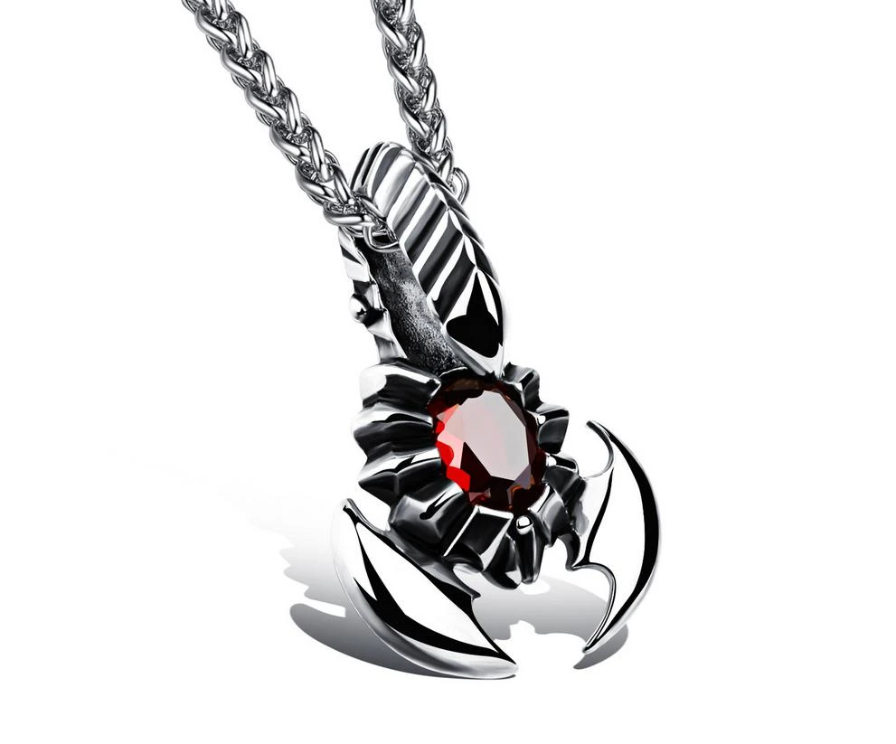 Ocelový náhrdelník s masivním přívěskem štíra. Přívěsek štíra má leštěný povrch ozdobený velkým červeným kamenem. Rozměr přívěsku 50x35mm. Ocelový řetízek s karabinovým zapínáním je dlouhý 60cm. Průměr řetízku 4mm.