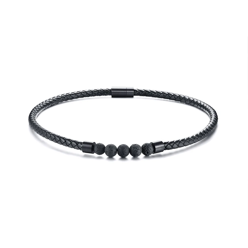 Kožený náhrdelník pro muže s lávovými korálky. Průměr kůže 6mm, průměr lávových korálků 8mm. Náhrdelník je dlouhý 44cm. Zapínání náhrdelníku je magnetické. Povrch ocelových částí náhrdelníku je upravený technologií IP na matnou černou barvu.