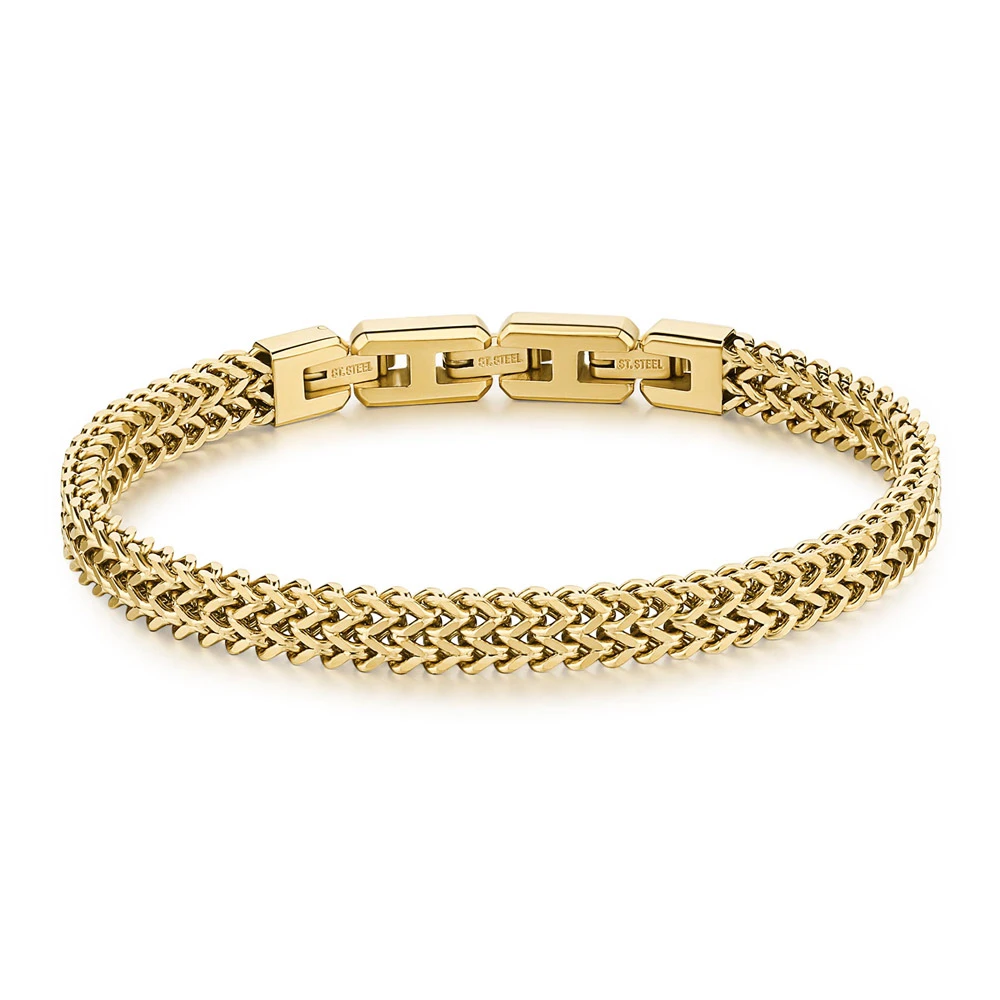 Náramek na ruku pro muže. Povrch náramku je pozlacený technologií PVD. Elegantní pánský dvouřadý náramek dlouhý 22cm.