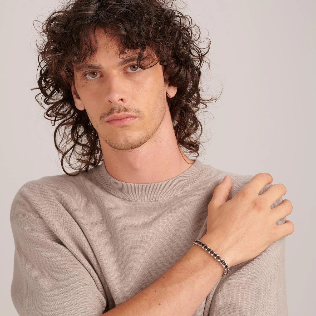 Pánský náramek na ruku z chirurgické oceli. Povrch náramku je leštěný, černé články náramku jsou matné upravené technologií PVD na černou. Náramkové zapínání je na klip.