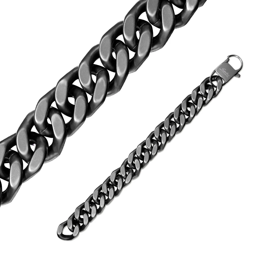Náramek pro muže z chirurgické oceli. Matný povrch náramku je upravený technologií PVD na černou. Náramek je široký 16mm. Zapínání náramku je karabinové.