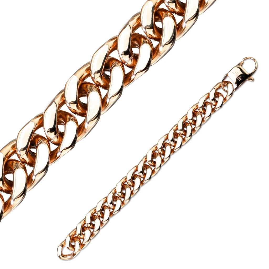 Náramek pro muže z chirurgické oceli. Leštěný povrch náramku je pozlacený technologií PVD. Náramek je široký 16mm. Zapínání náramku je karabinové.