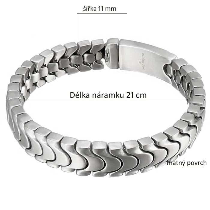 Náramek z chirurgické oceli pro muže. Povrch náramku je matný. Délka náramku 21cm, šířka 11mm. Náramek má zapínání na masivní klip.