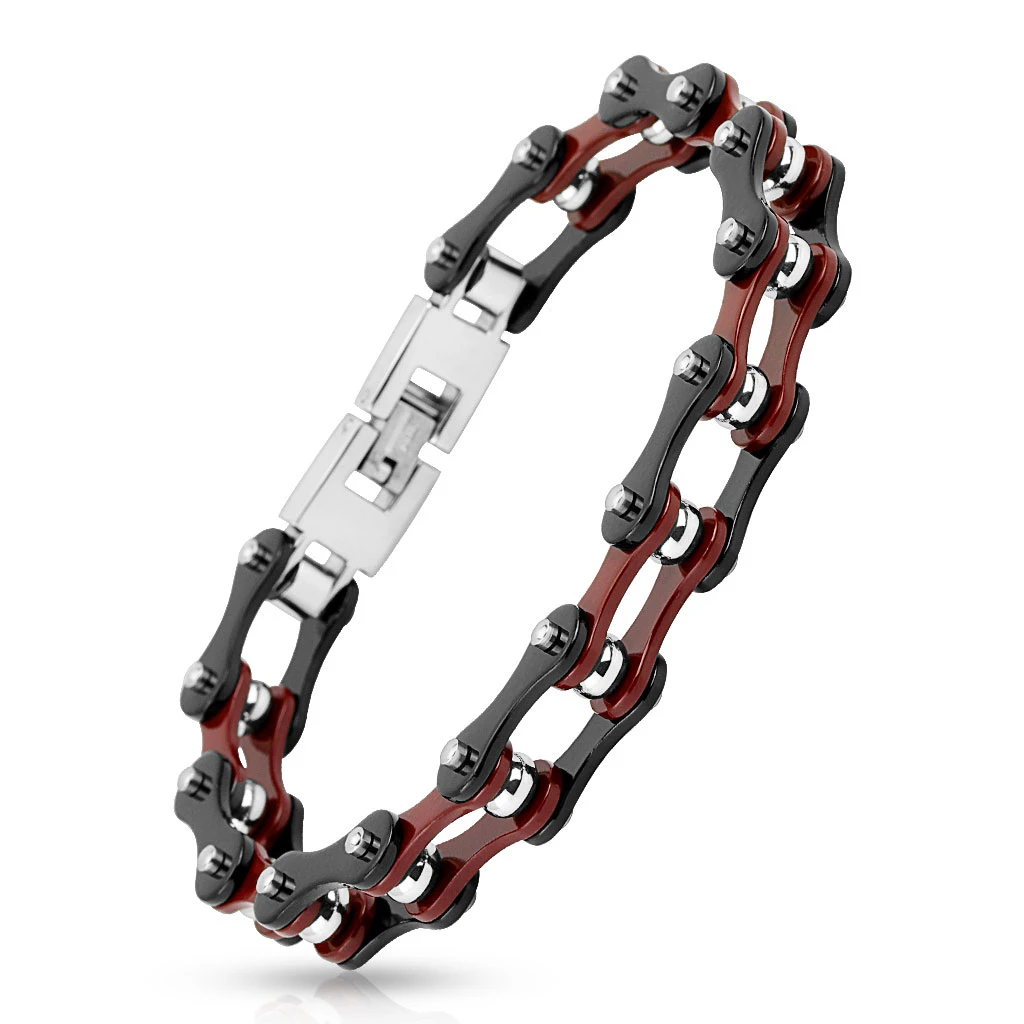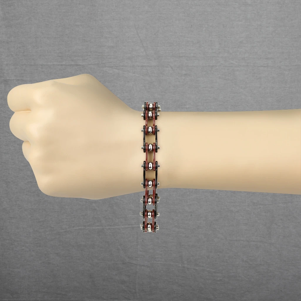 Náramek pro muže z chirurgické oceli napodobující řetěz. Povrch náramku je upravený černou a červenou barvou. Délka náramku 22,5 cm. Šířka 10 mm.