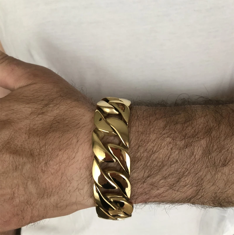 Náramek na ruku pro muže z chirurgické oceli. Povrch náramku je leštěný pozlacený technologií IP. Náramek je široký 26mm. Zapínání náramku je na masivní klip.