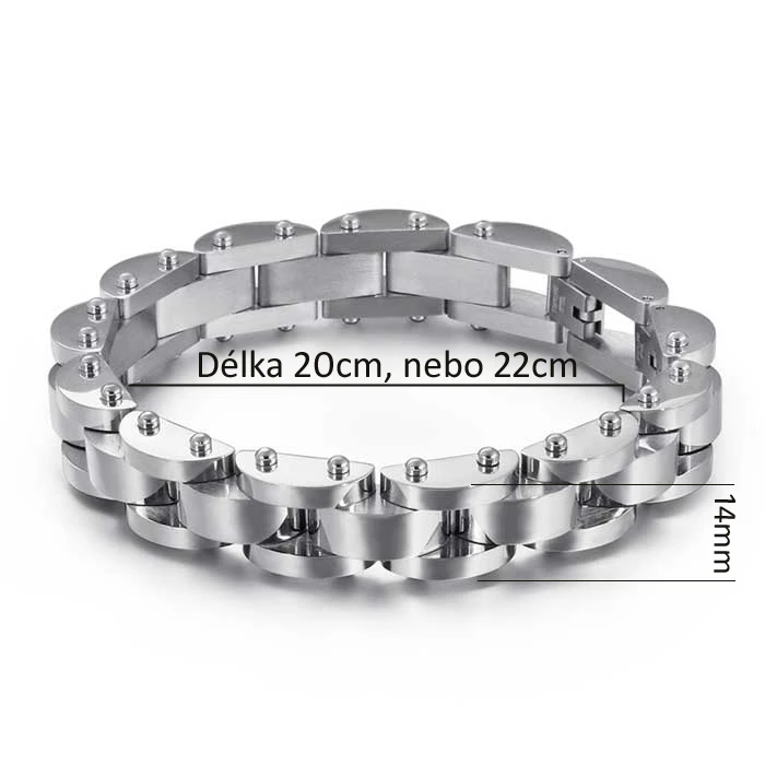 Náramek z chirurgické oceli pro muže. Povrch náramku je leštěný. Délku náramku lze díky dvojitému zapínání snadno upravit na 20cm, nebo 22cm. Šířka náramku 14mm.