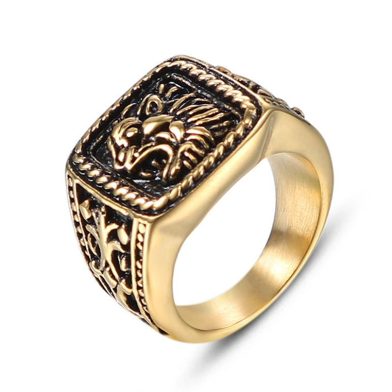 Pánský prsten z chirurgické oceli. Povrch prstenu je pozlacený technologií PVD. Obroučka prstenu je v nejužším bodě široká 5,5mm a postupně se rozšiřuje na 13mm. Rozměr pečetidla se lví hlavou 13x17mm.