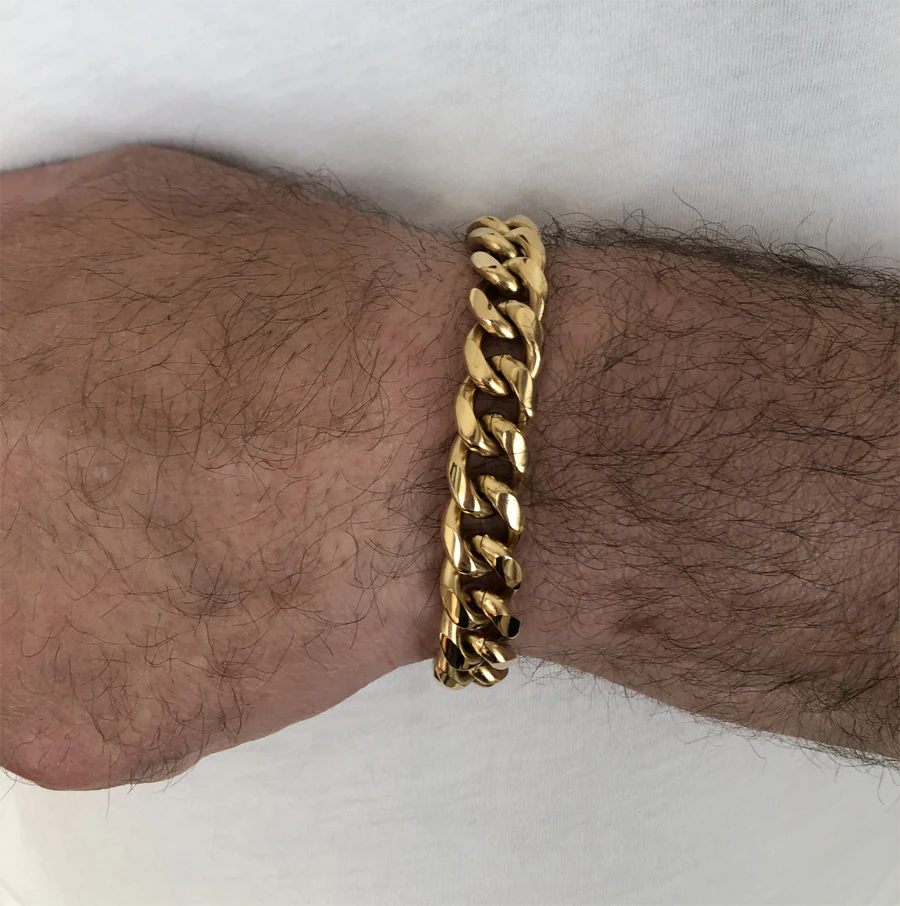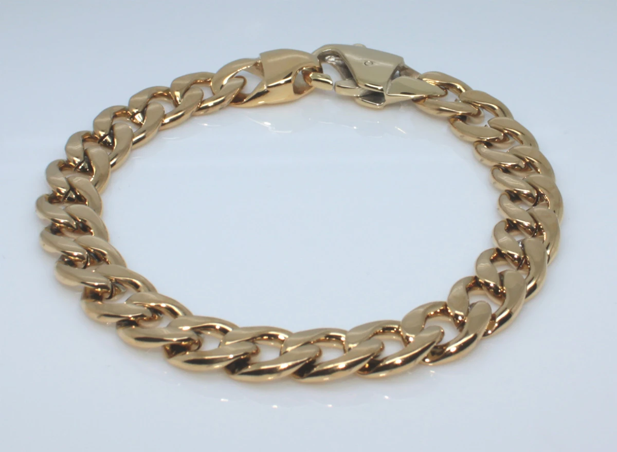 Náramek z chirurgické oceli pro muže s leštěným povrchem. Povrch náramku je pozlacený technologií PVD. Zapínání náramku je na karabinu. Délka náramku 21,5cm, šířka 13mm. Řetízek na ruku klasického vzoru Pancr.