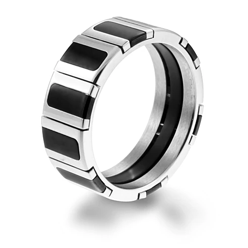 Prsten vyrobený z chirurgické oceli 316L. Prsten má leštěný povrch. Prsten kombinuje černou barvu s ocelí. Prsten je široký 8mm.