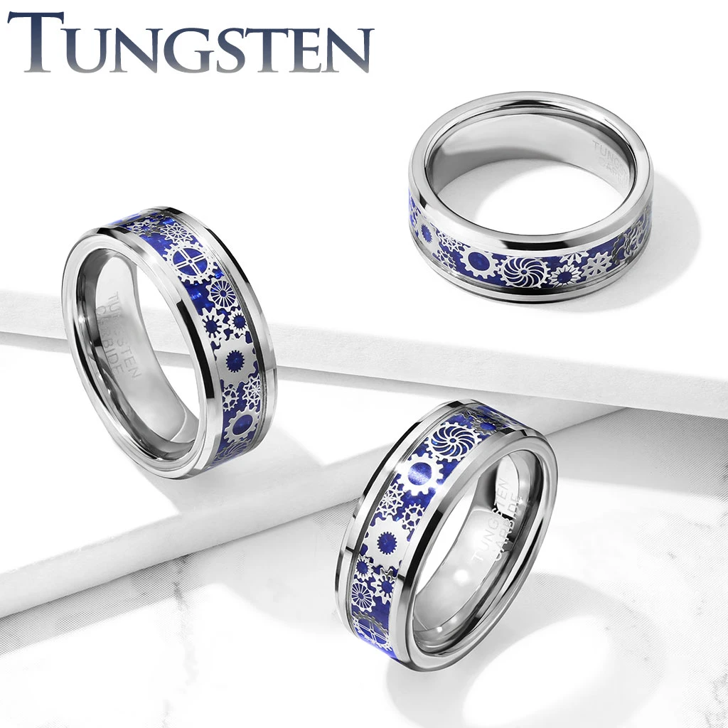 Moderní pánský prsten z wolframu se vzorem ozubeného soukolí. Wolfram se řadí nejtvrdší kovy s vysokou hustotou, a proto šperky z něj vyrobené jsou velmi odolné proti mechanickému poškození.