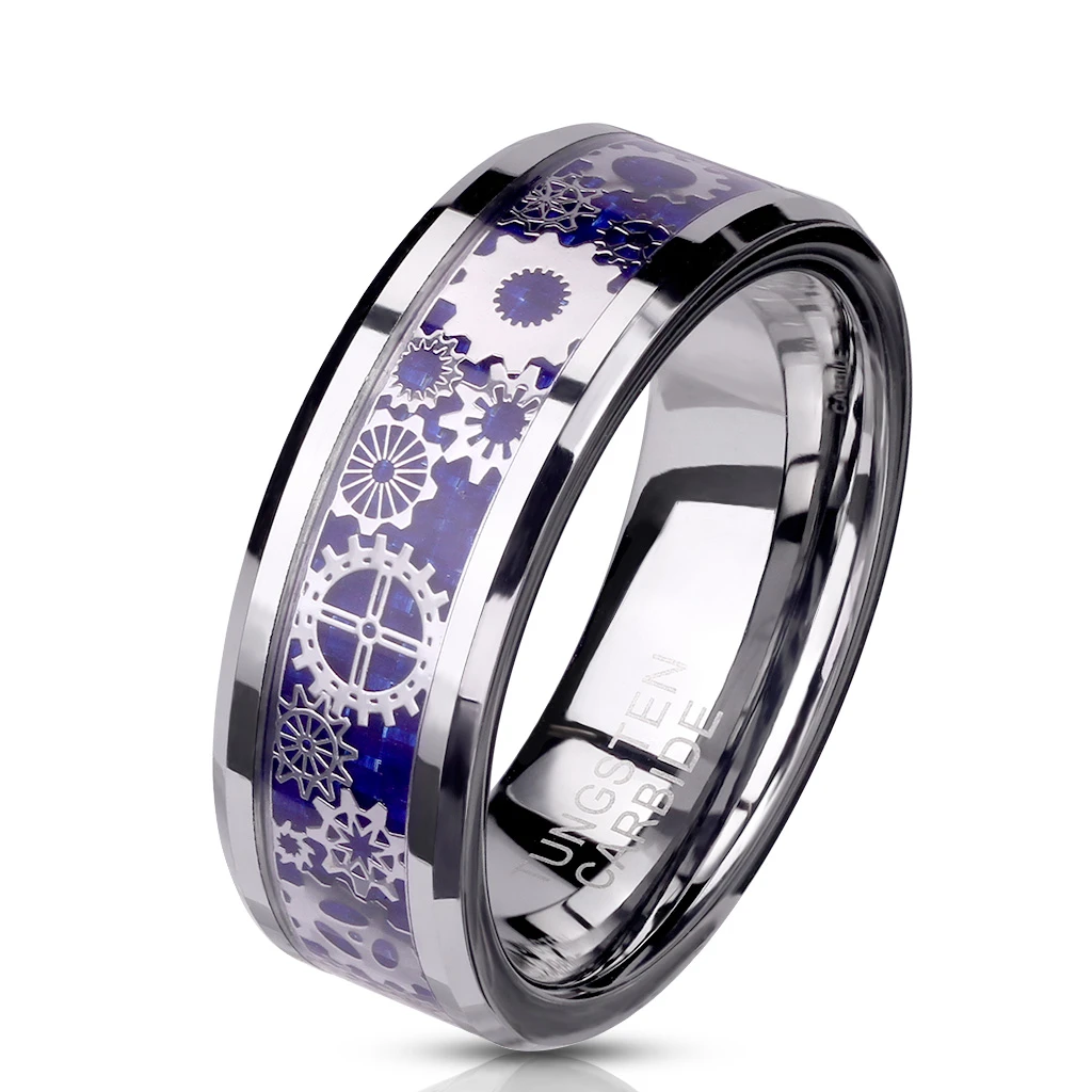 Prsten pro muže vyrobený z wolframu. Pánský prsten s industriálním vzorem ozubeného soukolí. Prsten je široký 8mm.