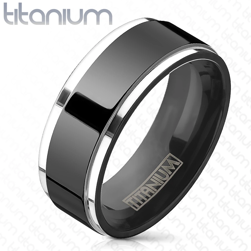 Titanový prsten pro muže. Povrch prstenu je leštěný upravený černou PVD barvou. Kraje prstenu jsou bez barevné úpravy. Prsten je široký 8mm.