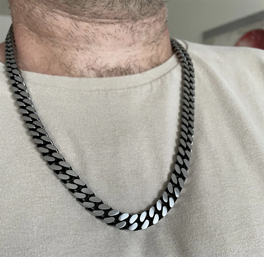 Řetízek z chirurgické oceli na krk pro muže. Povrch řetízku je matný v barvě pistolové šedi. Očka řetízku jsou široká 9mm, výška oček 4mm. Zapínání řetízku je nenápadný klip.