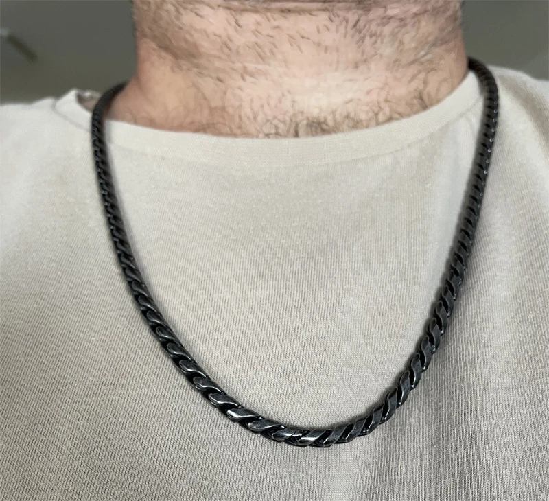 Pánský řetízek z chirurgické oceli. Povrch řetízku je upravený technologií PVD na barvu pistolové šedi. Řetízek je dlouhý 66cm, šířka 5mnm.