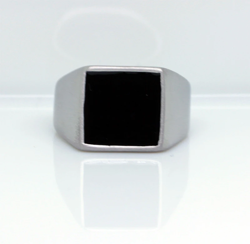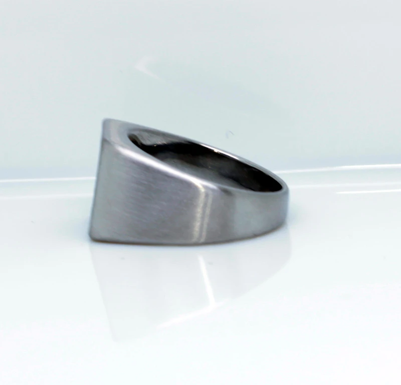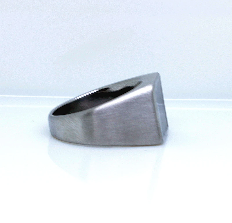 Pánský pečetní prsten z chirurgické oceli. Prsten má matný povrch. Pečetidlo je "zalité" černým emailem. Obroučka prstenu je v nejužším bodě široká 5mm a postupně se rozšiřuje na 14mm. Rozměr pečetidla 14x14mm.