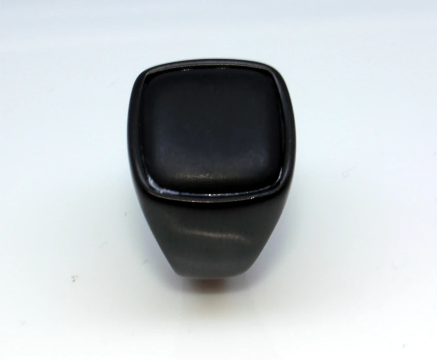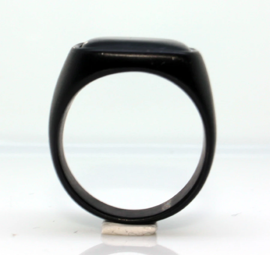 Pánský pečetní prsten z chirurgické oceli. Povrch prstenu je upravený matnou černou barvou nanesenou technologií PVD. Pečetidlo má rozměr 15x15mm. Obroučka prstenu je v nejširším bodě široká 18mm a postupně se zužuje na 6,5mm. Do pečetidla lze zajisti rytinu monogramu, nebo jiných symbolů, či znaků.
