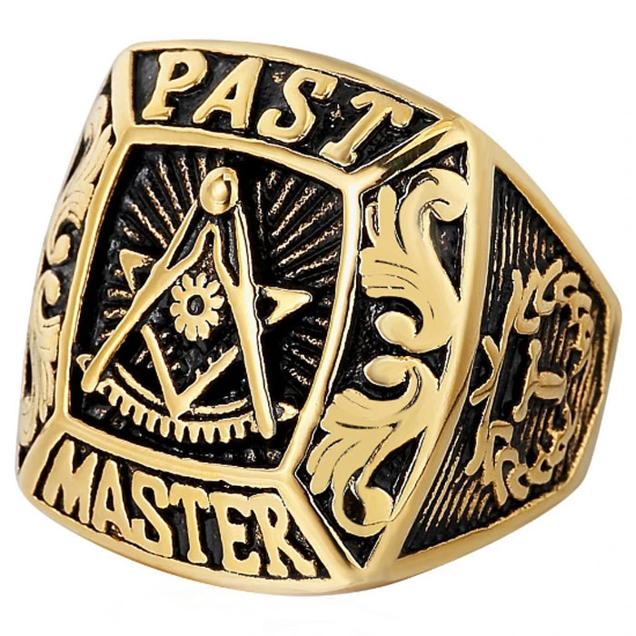Ocelový pečetní prsten se symboly Svobodných zednářů. Povrch prstenu je plastický pozlacený technologií PVD. Obroučka prstenu je v nejužším bodě široká 6mm a postupně se rozšiřuje na 22mm. Rozměr pečetní části prstenu 26x25mm.