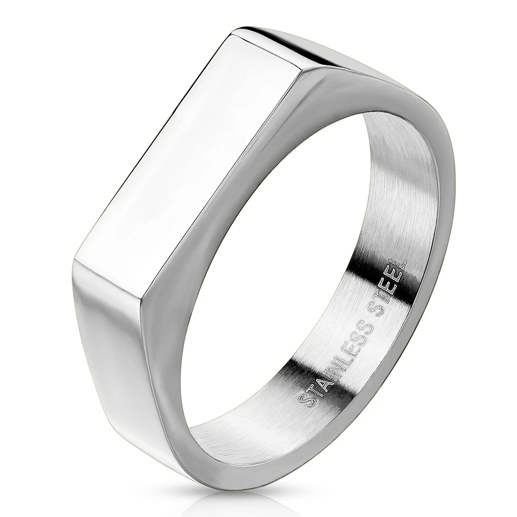 Ocelový pečetní prstýnek pro ženy s leštěným povrchem. Obroučka prstenu je široká 5mm. Rozměr pečetidla 5x14mm. Do pečetidla je možné vyrýt např. monogram.