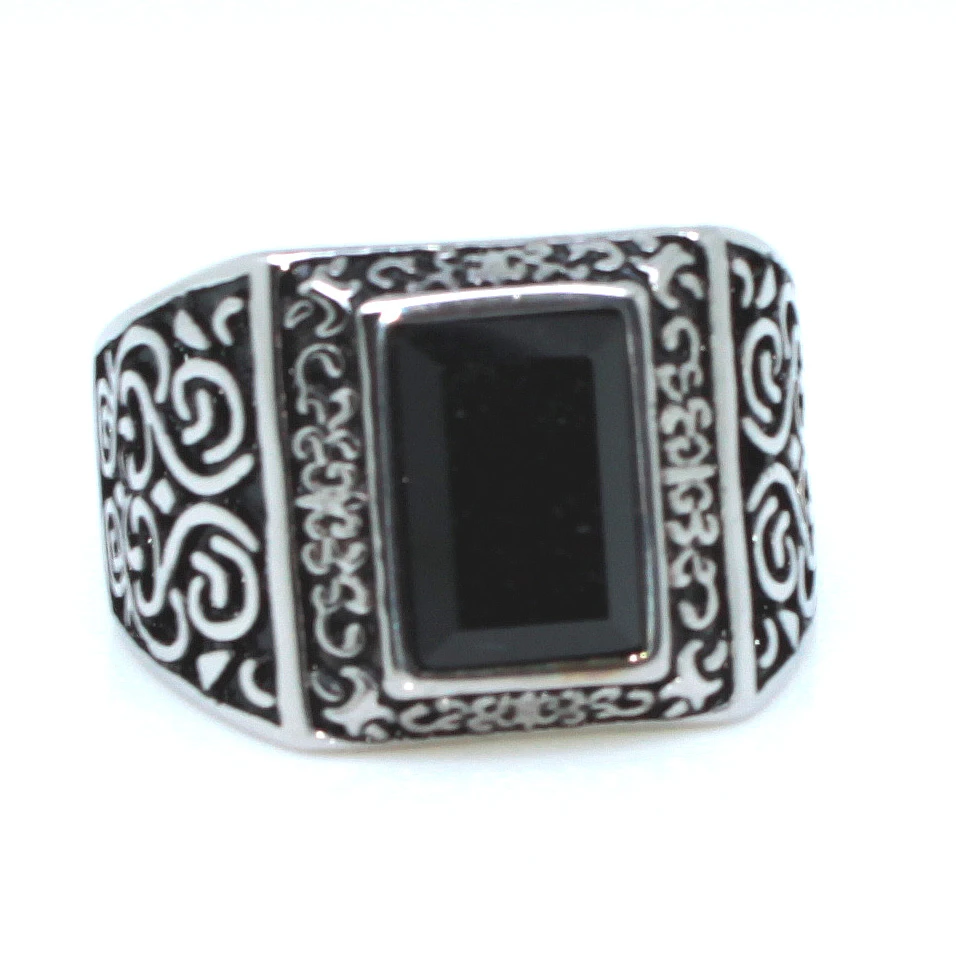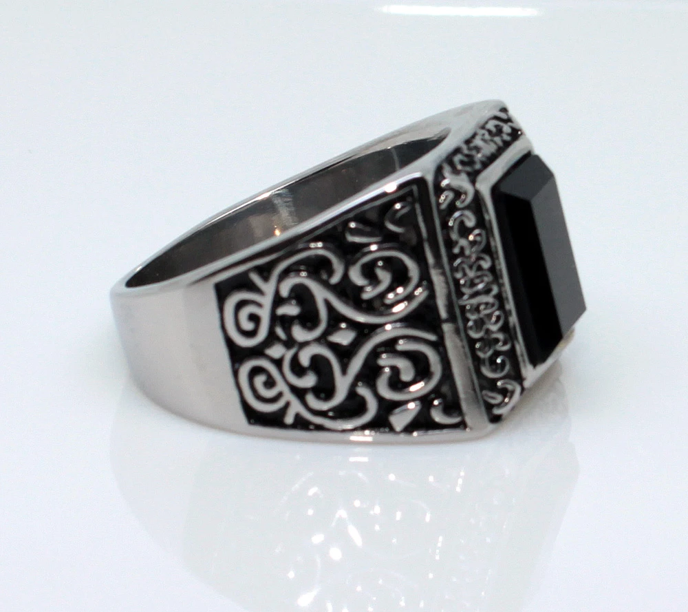 Pečetní prsten z chirurgické oceli s černým kamenem. Pečetní prsteny z chirurgické oceli jsou velmi oblíbené pánské šperky zejména pro vlastnosti, jaké chirurgická ocel má. K těmto vlastnostem patří především odolnost proti poškození, nevyvolávání alergických reakcí, chirurgická ocel neoxiduje, ani nemění barvu.