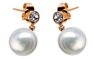 Dámské ocelové visací náušnice se zirkonem a umělou perlou. Povrch náušnic je upravený technologií PVD na barvu růžového zlata. Průměr perly 10 mm, průměr zirkonu 5 mm, celková délka náušnice 22 mm. Náušnicové zapínání je na puzetku.