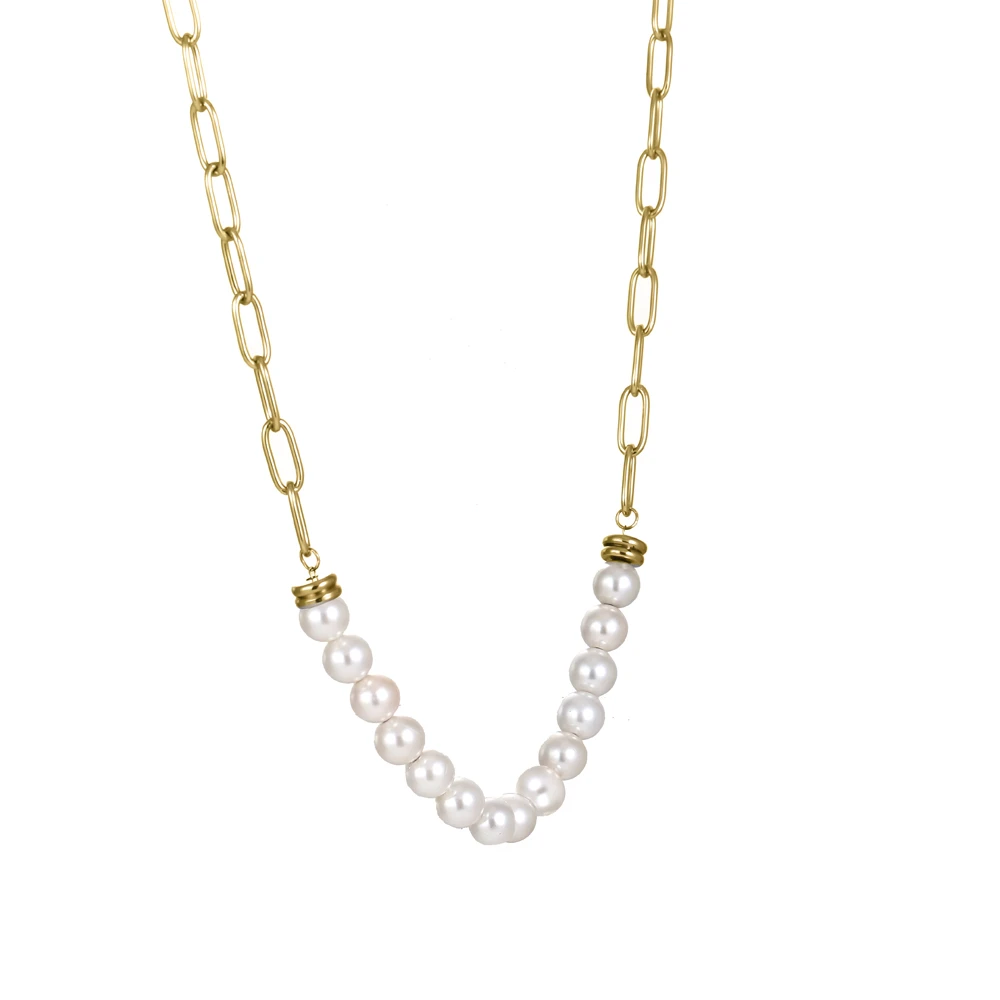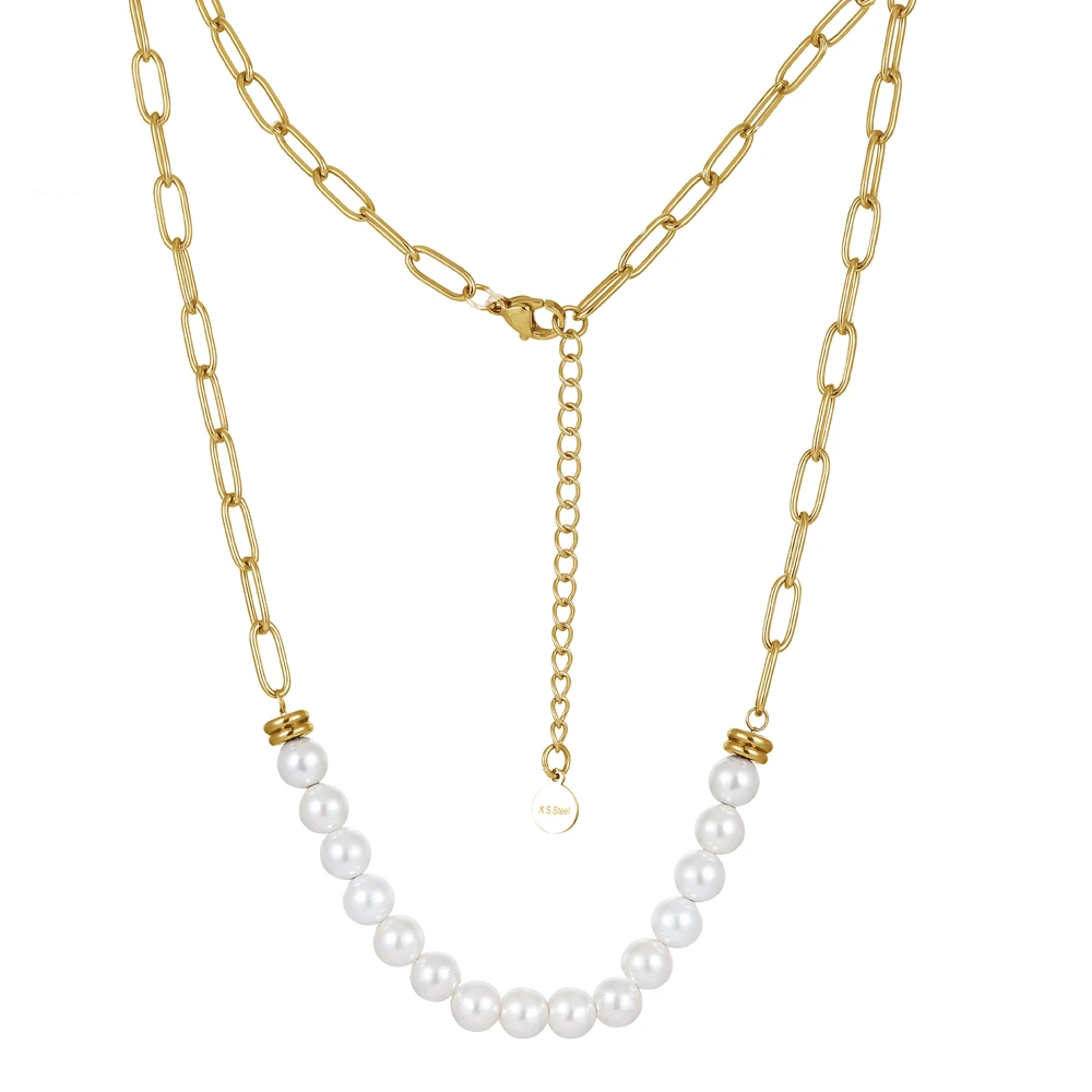 Náhrdelník z chirurgické oceli zdobený kultivovanými perlami. Povrch náhrdelníku je pozlacený technologií PVD. Bílé perličky mají průměr 6mm. Očka náhrdelníku mají rozměr 4x9mm. Délku náhrdelníku lze nastavit v rozmezí délek 45-50cm.