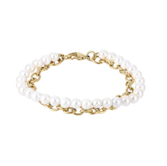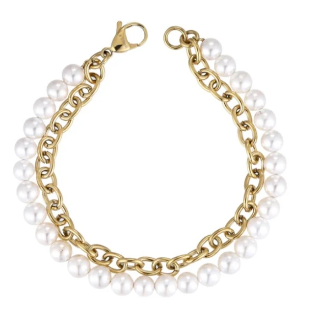 Náramek na ruku vyrobený z chirurgické ocel a přírodních perel. Povrch ocelových částí náramku je leštěný pozlacený technologií PVD, bílé perličky dodávají náramku nádech luxusu. Náramek je dlouhý 21cm. Perličky mají průměr 6mm, řetízková část náramku je široká 6mm. Náramek má karabinové zapínání.