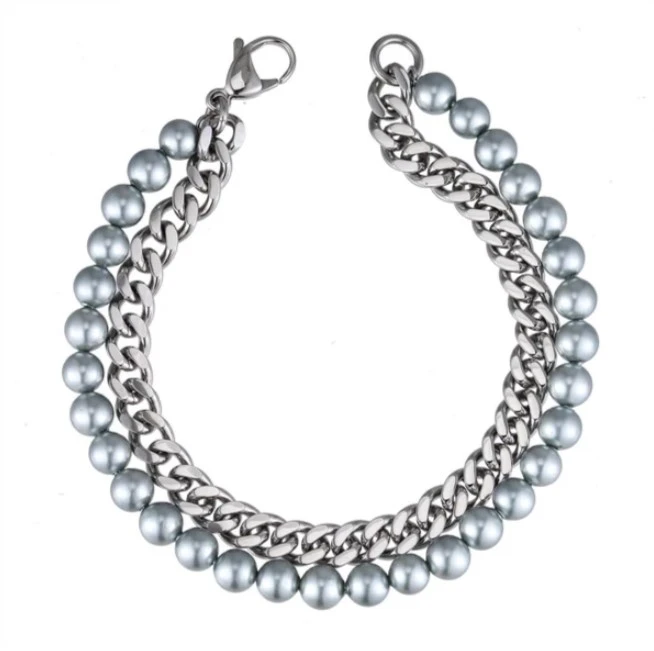 Náramek na ruku vyrobený z chirurgické ocel a přírodních perel. Povrch ocelových částí náramku je leštěný, šedé perličky dodávají náramku nádech luxusu. Náramek je dlouhý 21cm. Perličky mají průměr 6mm, řetízková část náramku je široká 6mm. Náramek má karabinové zapínání.