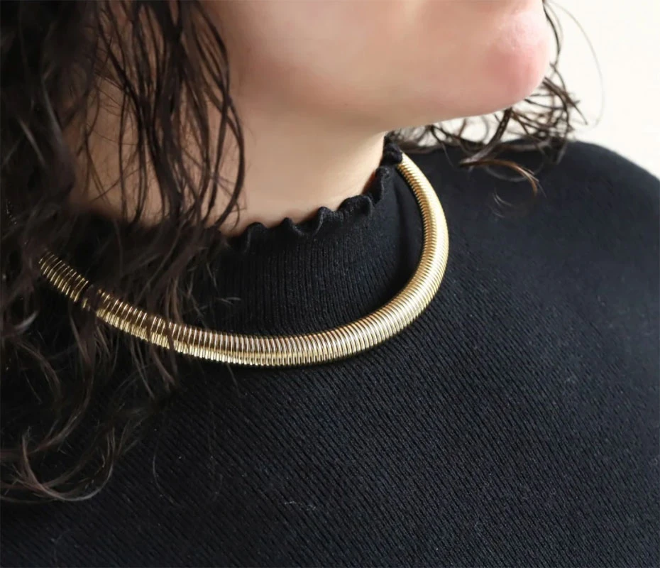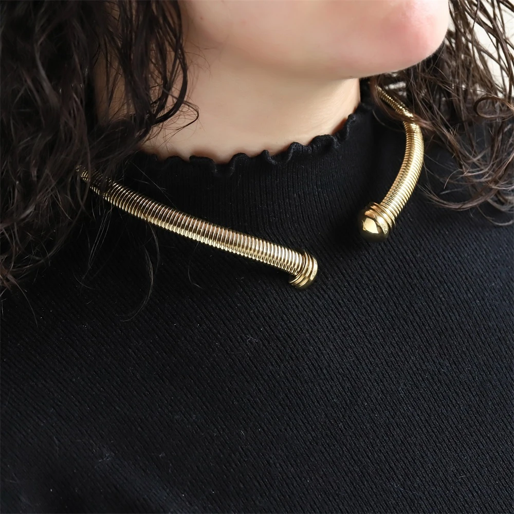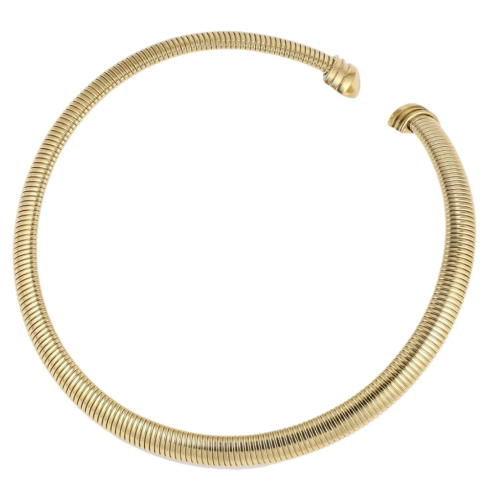 Pevný náhrdelník z chirurgické oceli. Pozlacený povrch náhrdelníku je leštěný. Vnitřní průměr náhrdelníku 130mm, šířka 10mm.