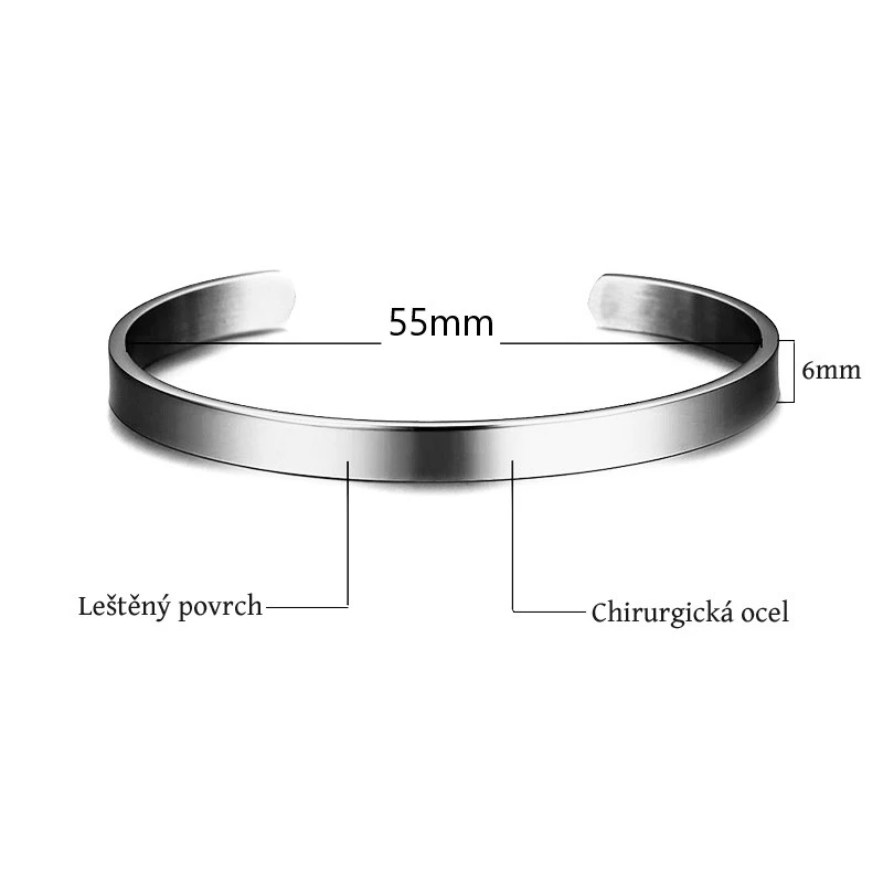 Ocelový pevný náramek na ruku z chirurgické oceli. Povrch náramku na pohledových stranách je leštěný, vnitřní strana náramku je matná. Náramek je široký 6mm, vnitřní průměr náramku 5,5cm.