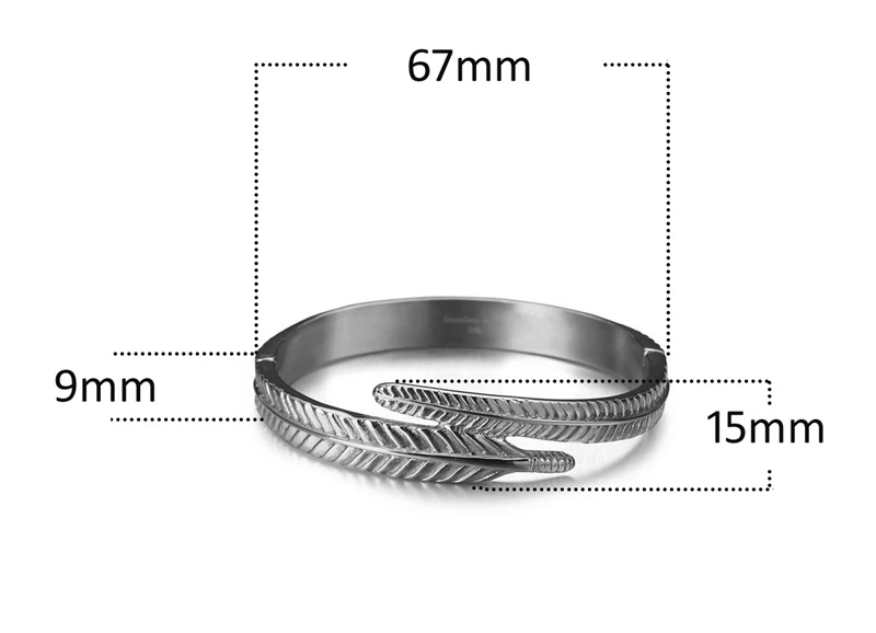 Dámský pevný náramek z chirurgické oceli. Vnější průměr náramku 67mm. Rozměry náramku najdete na podpůrném obrázku.