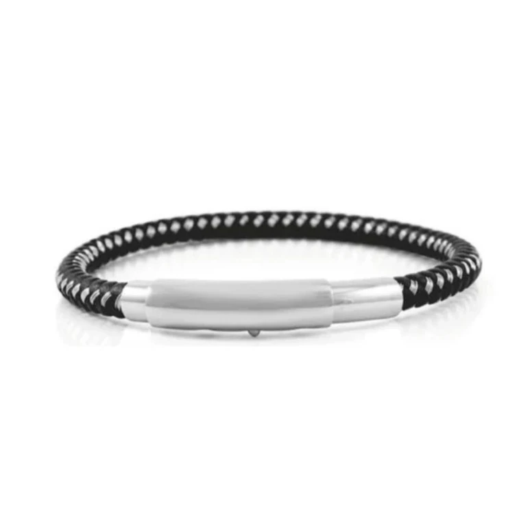 Náramek na ruku z chirurgické oceli a kůže. Ocelové lanko je opletené kůží. Průměr "těla" náramku 7mm. Náramek lze zapnou na úrovni délek 22,21,20cm.