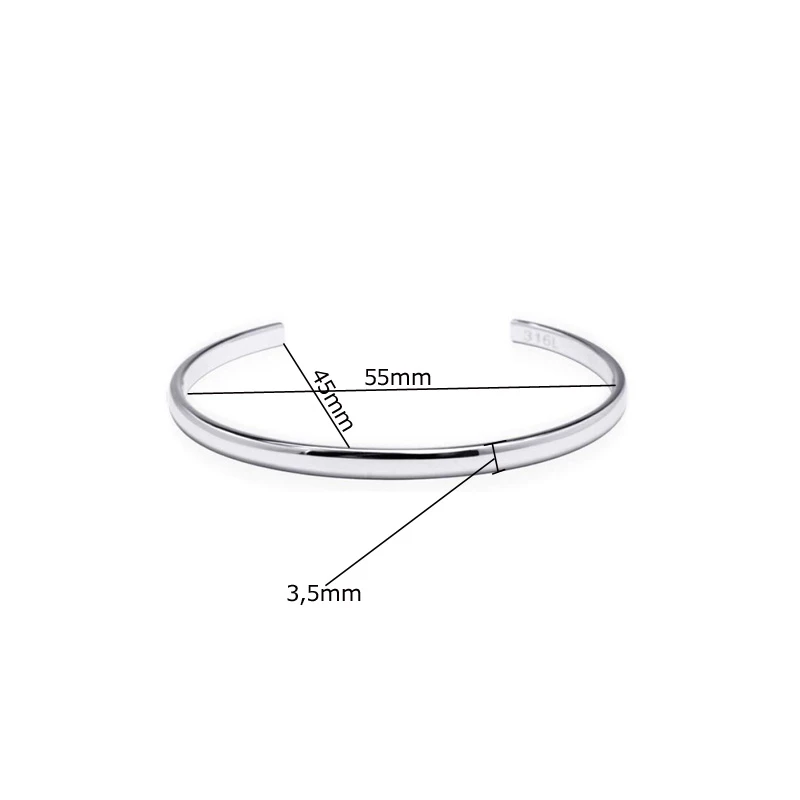 Pevný náramek na ruku z chirurgické oceli. Povrch náramku je leštěný. Náramek je široký 3,5 mm, vnitřní rozměry náramku 55x45mm.