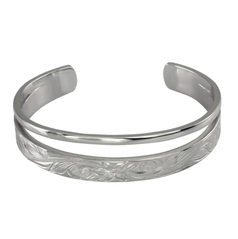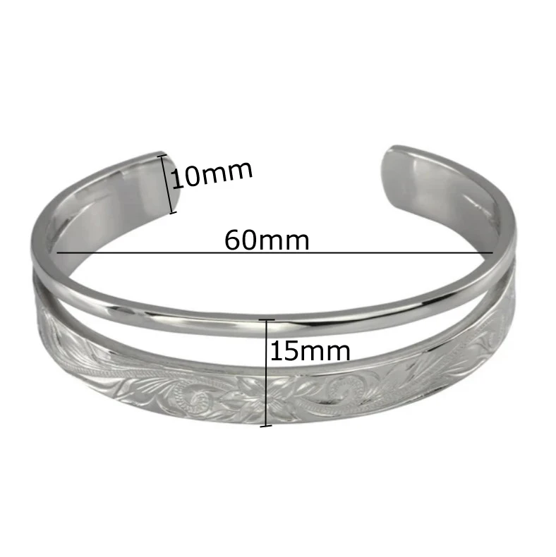 Ocelový pevný náramek na ruku. Povrch náramku je leštěný se vzorem. Náramek má vnitřní průměr 60mm, šířka náramku v nejširším bodě 15mm.