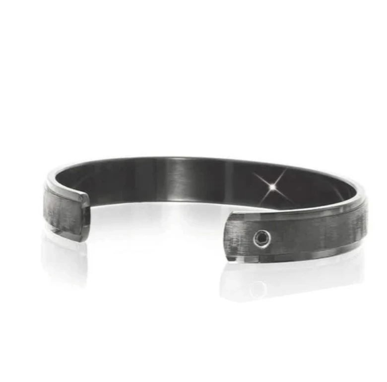 Pevný pánský náramek z chirurgické oceli. Povrch náramku je upravený černou PVD barvou. Kraje náramku jsou leštěné, střed je matný. Náramek je široký 10mm. Vnitřní průměr náramku 65mm. Do náramku je zasazený černý zirkon.