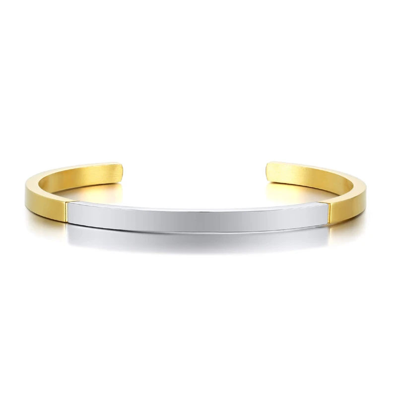 Pevný náramek z chirurgické oceli. Povrch náramku je leštěný. Zlaté části jsou zlacený technologií IP. Náramek je široký 4mm. Vnitřní průměr náramku 60mm.