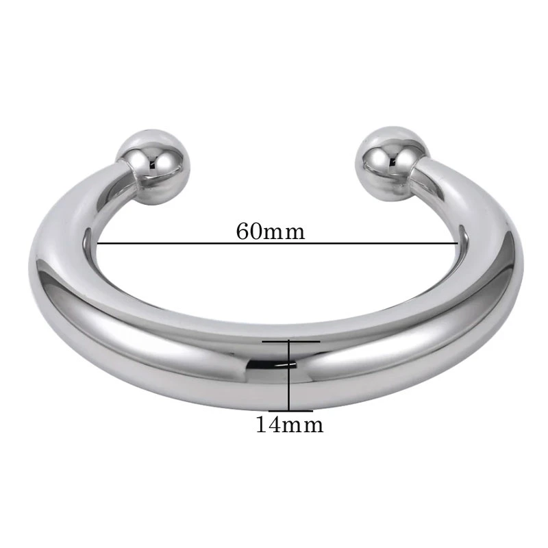 Pevný náramek z chirurgické oceli s hladkým leštěným povrchem. Vnitřní šíře náramku 60mm, šířka náramku 14mm. Náramek je dutý, proto je i přes své rozměry lehký. Rozměry najdete zobrazené na podpůrné fotografii.