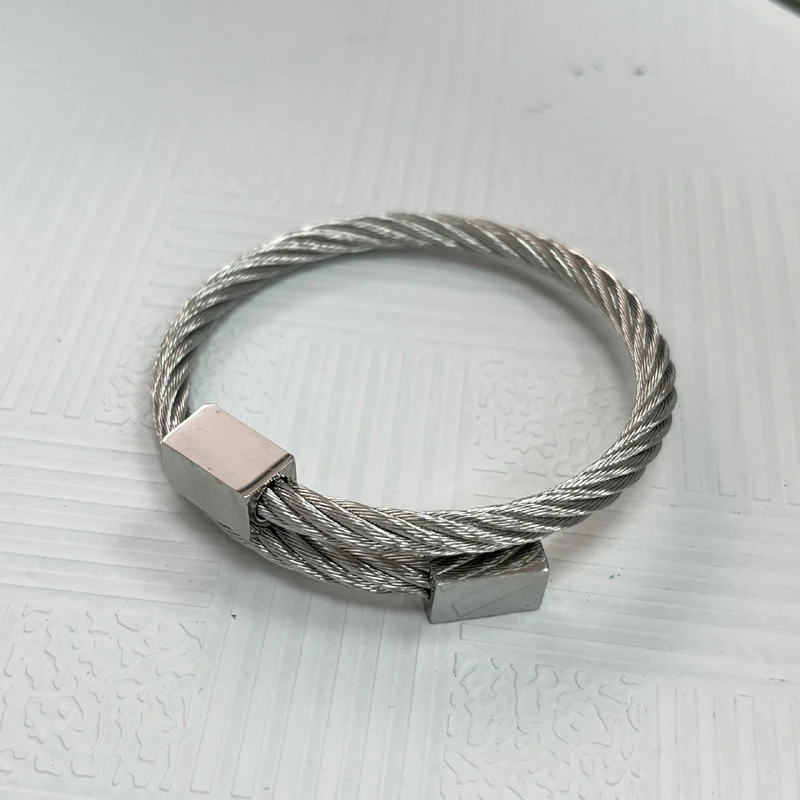 Náramek na ruku z chirurgické oceli. Pevný náramek z ocelového lanka o průměru 5mm. Na koncích náramku jsou hranoly o rozměru 8x8x13mm. Vnitřní průměr náramku 55mm.