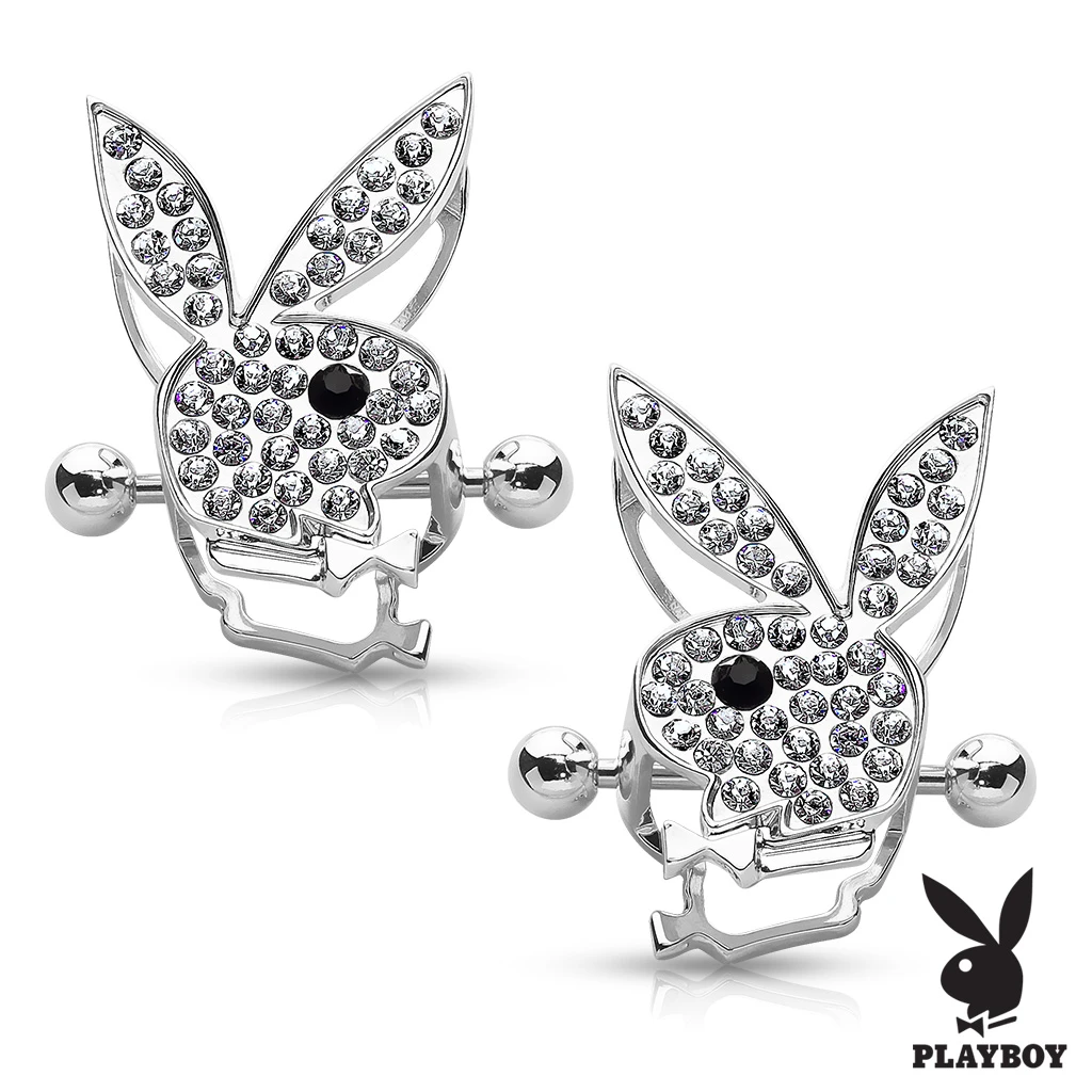 Piercing do bradavek se zajíčkem Playboy. Hlava zajíčka je z porodiované bižuterie. Dřík piercingu a kuličky jsou vyrobené z chirurgické oceli. Rozměr zajíčka 27x18mm, dřík má průměr 1,6mm, délka dříku 18mm, průměr kuliček 5mm. Uvedená cena platí za pár piercingu do bradavek.