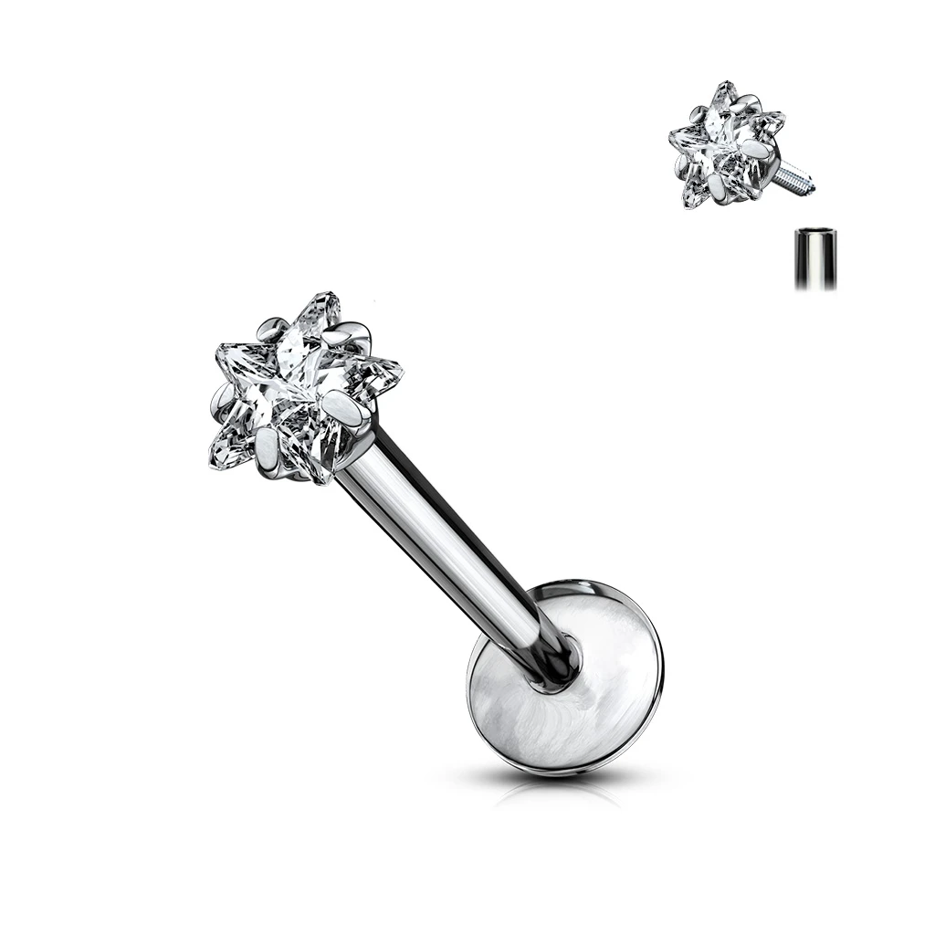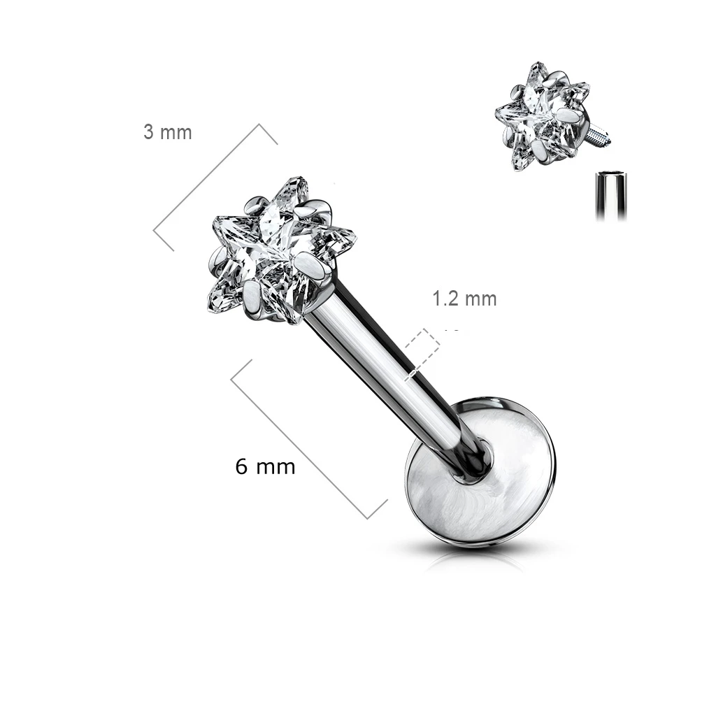Titanový piercing do brady se zirkonem ve tvaru hvězdy. Piercing je vyrobený z titanu s označením 6AL-4V-ELI ASTM F-136, který je zvlášť vhodný pro výrobu tělních implantátů. Dřík je dlouhý 6 mm, průměr dříku 1,2 mm, ozdoba s hvězdou má průměr 3 mm.