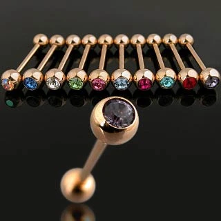 Piercing do jazyka. Piercing je z pozlacené chirurgické oceli 316L. Piercing je ozdobený zářivým kamínkem. Rozměry piercingu 1,6×16×6×5mm.