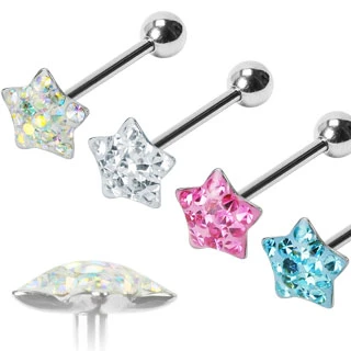 Piercing do jazyka. Piercing z chirurgické oceli 316L. Piercing s ozdobou hvězdy. Piercing zdobí zářivé krystaly. Rozměry piercingu 1,6×16×5×7mm.