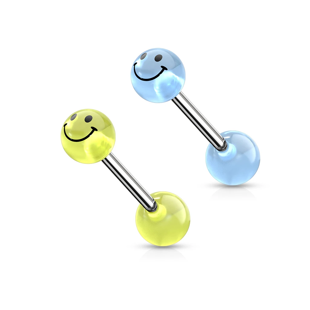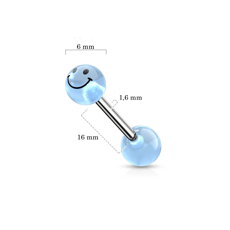 Piercing jazyka se dříkem z chirurgické oceli a kuličkami svítícími ve tmě. Dřík piercingu je dlouhý 16mm, průměr dříku 1,6mm. Kuličky mají průměr 6 mm.