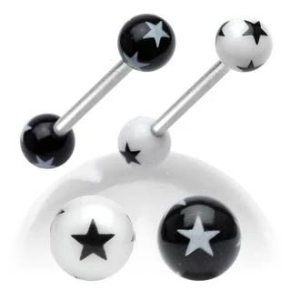 Piercing do jazyka s ocelovým dříkem, kuličky s hvězdami jsou bioplastové.