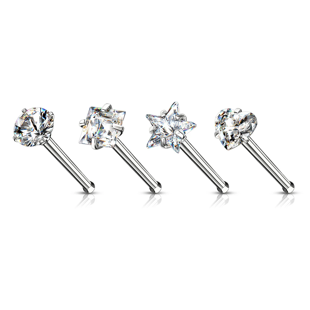 Piercing nosu z chirurgické oceli se zirkonem v sadě 4 kusů. Dřík piercingu má průměr 0,8mm, délka dříku 7mm. Ozdoby se zirkonem mají průměr cca 3mm.
